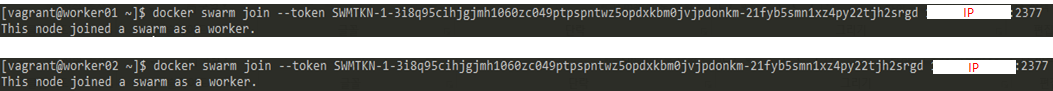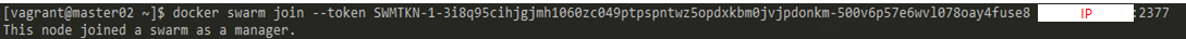 $ docker swarm join --token SWMTKN-1-3i8q95cihjgjmh1060zc049ptpspntwz5opdxkbm0jvjpdonkm-500v6p57e6wvl078oay4fuse8 <Manager 노드 IP>:2377