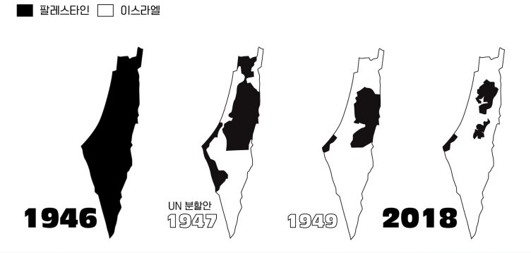 유엔이 이렇게 땅을 나눠주기 전에 합법적으로 이스라엘 민족이 구입한 땅은 팔레스타인 국토의 5% 정도 뿐이었다. 그러니까 영국과 유엔이 개입해서 이스라엘 민족의 거주지를 5% -> 60%로 늘려준 것이다. 그럼 55%는 당연히 팔레스타인에게서 강제로 뺏은 것이다. 얼마나 폭력적인가.