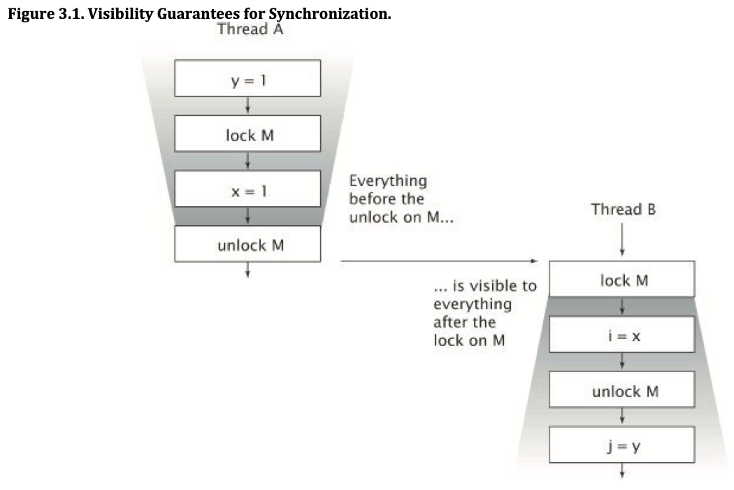 그림 3.1에 설명 된 것처럼 하나의 스레드가 다른 스레드의 영향을 예측 가능한 방식으로 볼 수 있도록 내장 잠금을 사용할 수 있습니다. 스레드 A가 동기화 된 블록을 실행 한 다음 스레드 B가 동일한 잠금에 의해 보호되는 동기화 된 블록에 들어가면 잠금을 해제하기 전에 A에 표시되었던 변수 값은 잠금을 획득 할 때 B에 표시됩니다. 다시 말해, 동기화 된 블록에서 또는 이전에 수행 된 모든 A는 동일한 잠금으로 보호 된 동기화 된 블록을 실행할 때 B에 표시됩니다. 동기화가 없으면 그러한 보장이 없습니다.