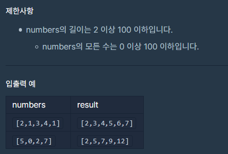 [๋ฌธ์ ] ์ ์ ๋ฐฐ์ด numbers๊ฐ ์ฃผ์ด์ง๋๋ค. numbers์์ ์๋ก ๋ค๋ฅธ ์ธ๋ฑ์ค์ ์๋ ๋ ๊ฐ์ ์๋ฅผ ๋ฝ์ ๋ํด์ ๋ง๋ค ์ ์๋ ๋ชจ๋ ์๋ฅผ ๋ฐฐ์ด์ ์ค๋ฆ์ฐจ์์ผ๋ก ๋ด์ return ํ๋๋ก solution ํจ์๋ฅผ ์์ฑํด์ฃผ์ธ์. [๋ด ํ์ด] ๋ด ํ์ด์ ๋ฌธ์ ์ ํ๋, ์ list๋ฅผ ์ผ์ง? list๋ฅผ ์ผ๊ธฐ๋๋ฌธ์ ์ค๋ณต ๊ฒ์ฌ๋ฅผ ํ๋ ๊ณผ์ ์ ๊ฑฐ์ณ์ผ ํ๋ค. ๋ฌธ์ ์ ๋, ์ list์ stream ์ ํ์ฉํ์ง ์์๋? stream์ mapToInt()๋ผ๋ ํจ์๋ฅผ ์๊ฐ๋ ๋ชปํ๋ค... mapToInt()๋ฅผ ์ฌ์ฉํ๋ฉด Integer๋ฅผ int๋ก ํ ๋ณํํ๊ฑฐ๋ list์ ๊ฐ์ Array๋ก ์ฎ๊ธฐ๊ธฐ ์ํด ๋ for๋ฌธ์ ๋๋ฆฌ๋ ์์ ์ ํ์ง ์์๋ ๋๋ค. import java.util.*; class Solution { public in..